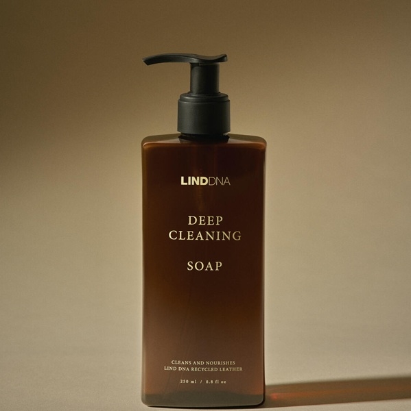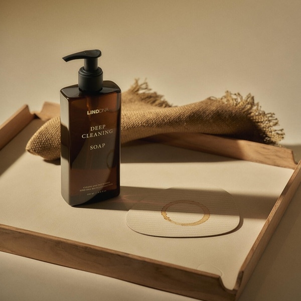 Lind DNA's Deep Cleaning sæbe er en flydende sæbe udviklet specielt til dybderengøring af LIND DNA dækkeservietter og coaster i genanvendt læder. Opløs blot sæben i lidt vand og tør forsigtigt dine dækkeservietter over med en svamp, og lad sæben skumme op. Fjern efterfølgende skummet med en fugtig klud. Ved genstridige pletter, lad skummet virke nogle få minutter inden det fjernes med en fugtig klud.